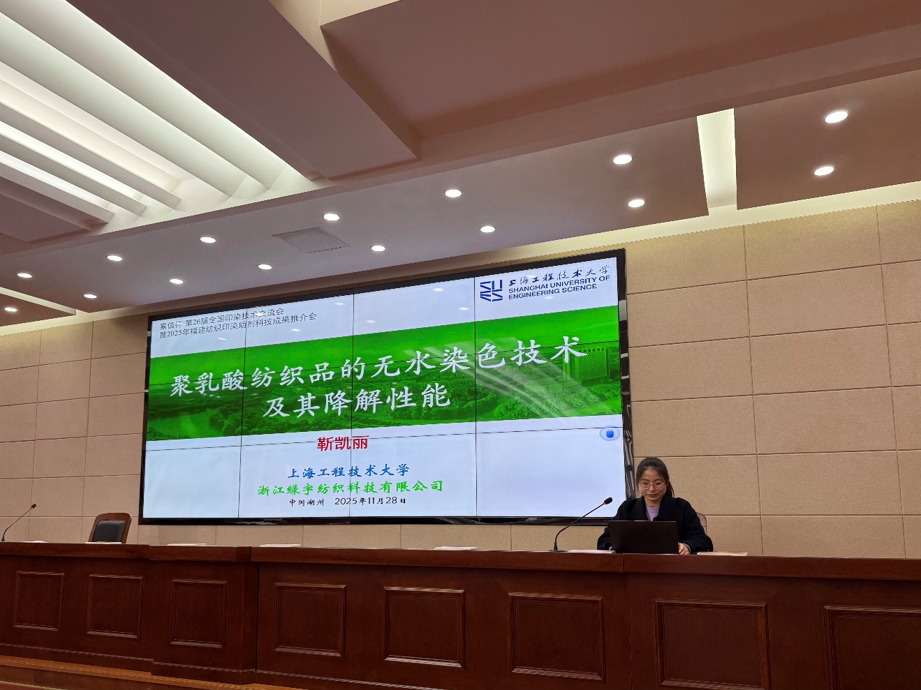 11月28日下午,必威betway西汉姆靳凯丽参加湖州市国家可持续发展议程创新示范区节能降碳减排技术供需对接会,并以“聚乳酸纺织品的无水染色技术及其降解性能”为主题进行主旨报告。