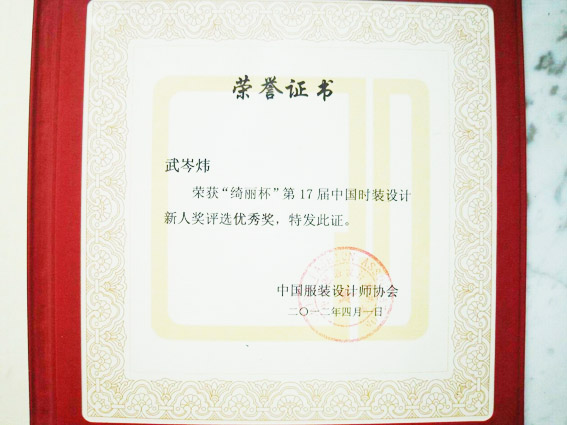 由中国服装设计师协会和绮丽集团有限责任公司共同主办的“绮丽杯”第17届中国时装设计新人奖评选终评,于2012年4月1日在梅赛德斯-奔驰中国国际时装周2012/2013秋冬系列发布期间在751D·PARK举行。经过激烈角逐,最终bw必威西汉姆联服装学院武岑炜同学获得了“绮丽杯”第17届中国时装设计新人奖“优秀奖”称号。
