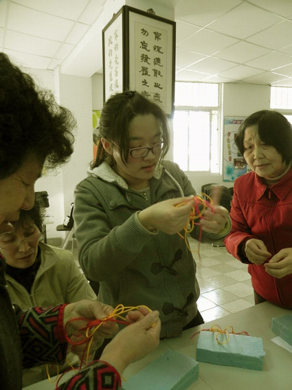 3月21号下午,服装学院科学商店成员一行5人来到对接单位——松江区岳阳街道民乐社区服务中心,与社区内的居民朋友们一同开展了“编制中国结”手工编织活动。