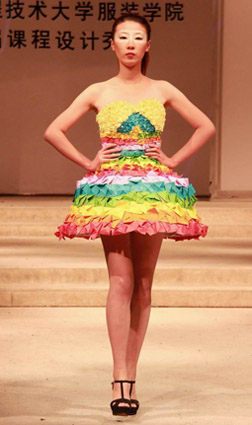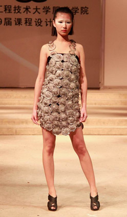 这次参加展示的服装均由非服用材料制成,在服装设计中除了对面料本身的处理和运用之外,对服装面料的拓展也是服装设计很重要的一部分。除了金属、塑料、纸张等一些比较常用的材料外,还有同学使用树叶和谷物等来完成他们的作品。虽然非服用材料可塑性不如纺织品,在制作工艺上难度颇高,不仅不易弯折,而且不方便保存和携带。但经过同学们一遍遍的尝试和修改后,最终完美地展示在舞台上。