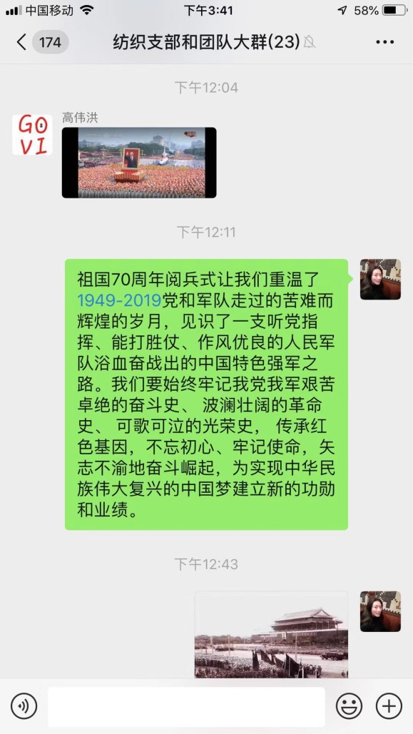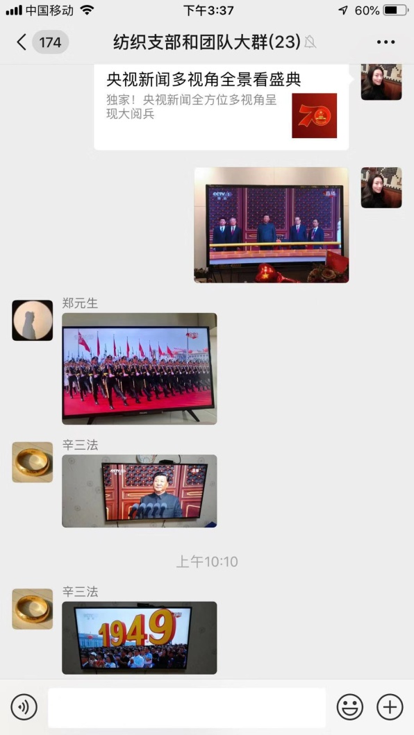 2019年10月1日上午10点,服装学院纺织工程党支部组织全体党员在家观看了庆祝祖国70周年华诞阅兵式,并在支部微信群进行了交流。