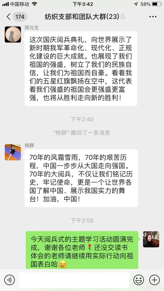 杨群老师在群里发表了“70年的风霜雪雨,70年的艰苦历程,中国一步步从大国走向强国。70年的大阅兵,不仅让我们铭记历史,牢记使命,更是一个让世界各国了解中国、展示我国实力的舞台!加油,中国!”的感言。