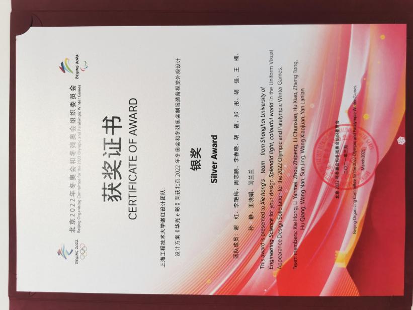 Finally, the No. 068 design proposal “Splendid Light, Colourful World” by the SUES design team stood out and won the Silver Award and Organization Contribution Award. The uniforms will be collected by Beijing Olympic Museum. The design team of our school completed the task entrusted by the National Olympic Committee and made contributions to the Beijing 2022 Winter Olympics and Paralympics.