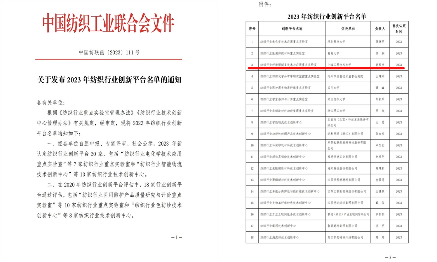依据中国纺织工业联合会《关于发布2023年纺织行业创新平台名单的通知》(中国纺联函{2023}111号),必威betway西汉姆纤维材料研究中心申报的“纺织行业纤维膜制备技术与应用重点实验室”获得批准,标志着我校在纺织学科建设方面取得重要进展。